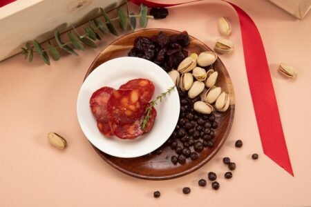 2 Cervezas Corona, pistachos con sal (30g aprox), arándanos (30g aprox), chocolate crocante (30g aprox) y carnes maduradas (100g)