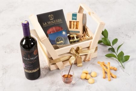 Canasta de madera en pino que contiene botella de vino tinto (750 ml), grissinis con queso parmesano (90g aprox), miel artesanal (130 ml), carnes maduradas (30g) y galletas de mantequilla