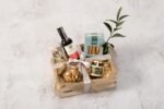 Canasta de madera en pino que contiene botella de vino tinto (750 ml), grissinis con queso parmesano (90g aprox), miel artesanal (130 ml), carnes maduradas (30g) y galletas de mantequilla