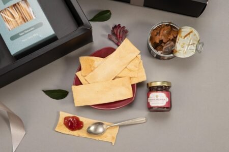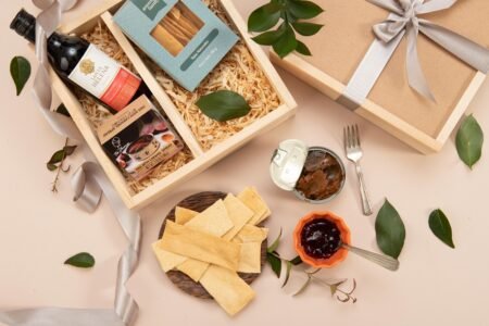 Caja de madera con mini botella de Prosecco (200 ml), pistachos con sal (40g aprox), almendras (40g aprox), carnes maduradas (100g) y reducción balsámico (330 ml).