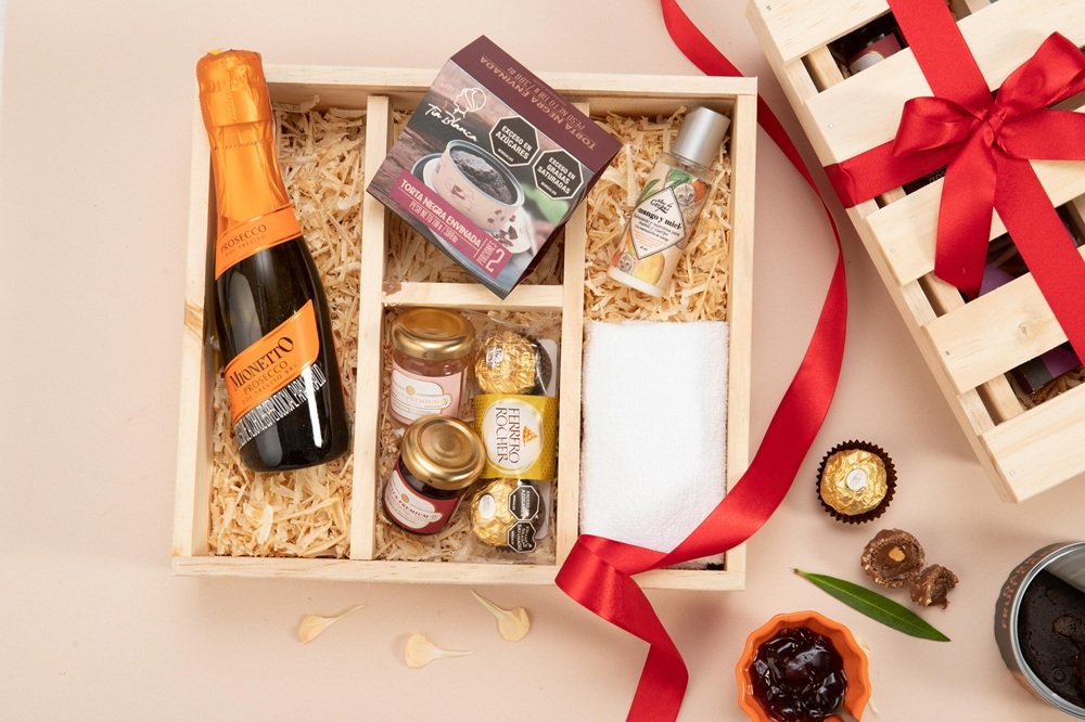 Mini botella de Prosecco (200 ml) acompañada de torta negra (110g), 2 confituras de vino (rosado y tinto – 30 ml cada una), chocolates Ferrero, crema hidratante, toalla facial y corazón bordado artesanal