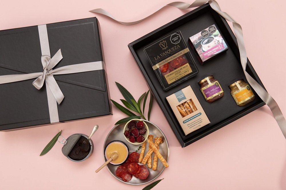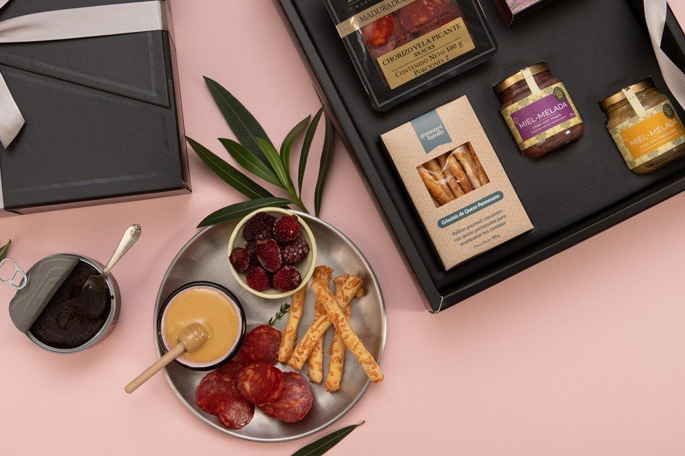 Grissinis con queso parmesano (90g aprox), miel melada de mora (130 ml), miel melada de maracuyá (130 ml), snacks de carnes maduradas (100g) y torta negra envinada (110g).