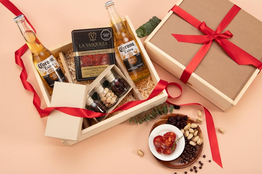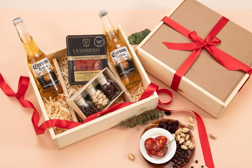 2 Cervezas Corona, pistachos con sal (30g aprox), arándanos (30g aprox), chocolate crocante (30g aprox) y carnes maduradas (100g)