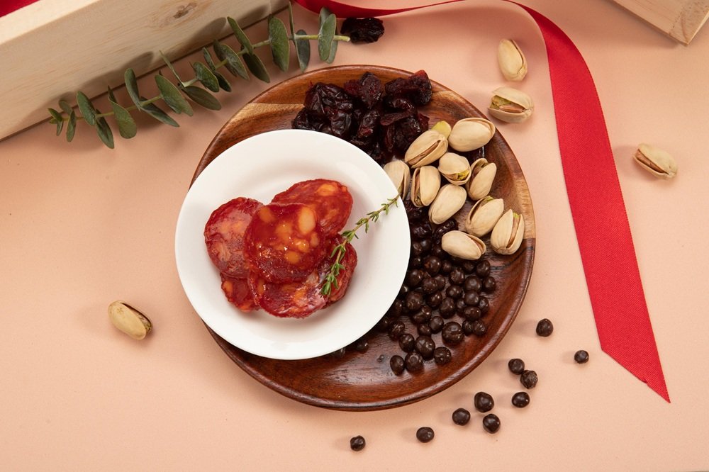 Botella de vino (750 ml) acompañada de aceitunas enteras, pistachos 40g aprox), almendras (40g aprox), pirulines, chorizo entero (100g), dulce de fruta (130 ml), grissinis con queso parmesano (90g aprox) y mix tropical(40g aprox)