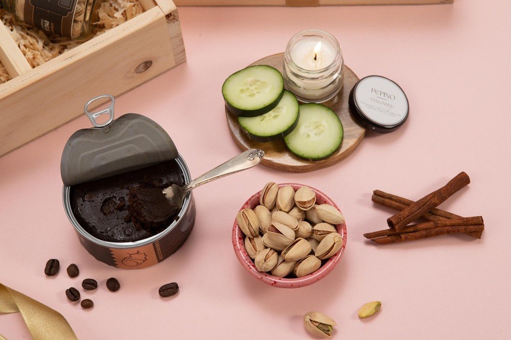 Café La Colina (125g), pistachos con sal (40g aprox), torta negra envinada (100g aprox) y 2 mini velas aromáticas