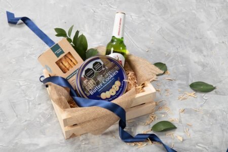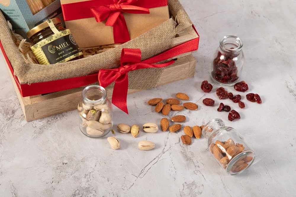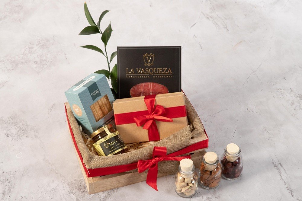Canasta de madera en pino que contiene botella de vino tinto (750 ml), grissinis con queso parmesano (90g aprox), miel artesanal (130 ml), carnes maduradas (30g) y galletas de mantequilla