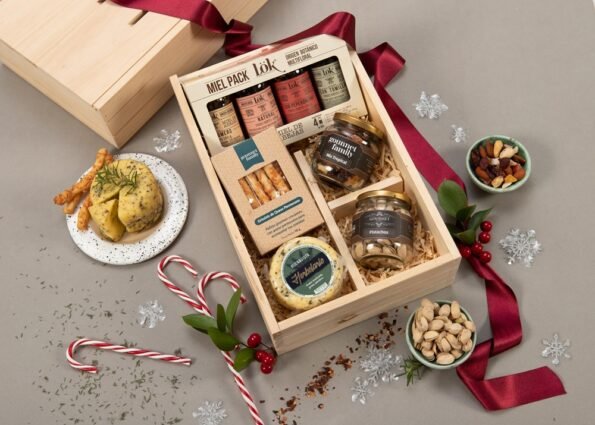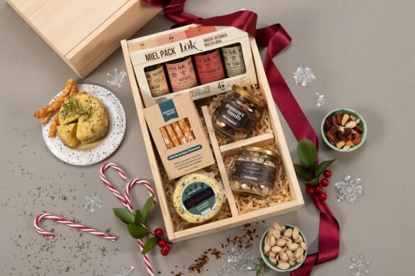 Kit de mieles Lok (Tomillo, natural, romero, peperoncino), queso finas hierbas Herbolario (300g), grissinis con queso parmesano (90g aprox), pistachos con sal (40g aprox) y mix de nueces y frutas deshidratadas (40g aprox).