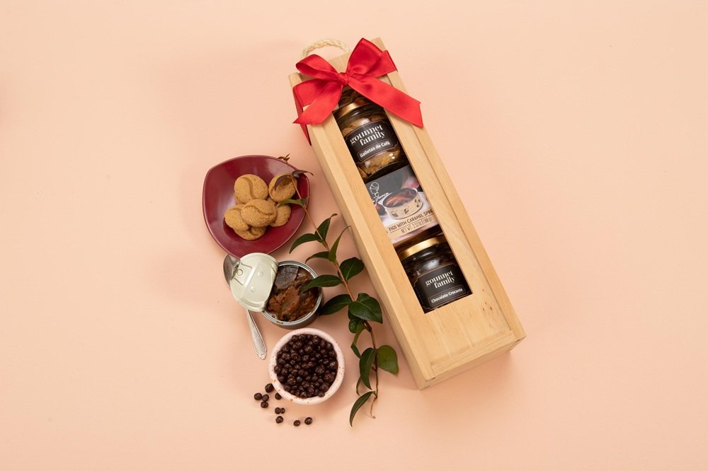 Hermosa caja de madera que contiene galletas de café (40g aprox), torta (100g) y chocolate crocante (50g aprox).