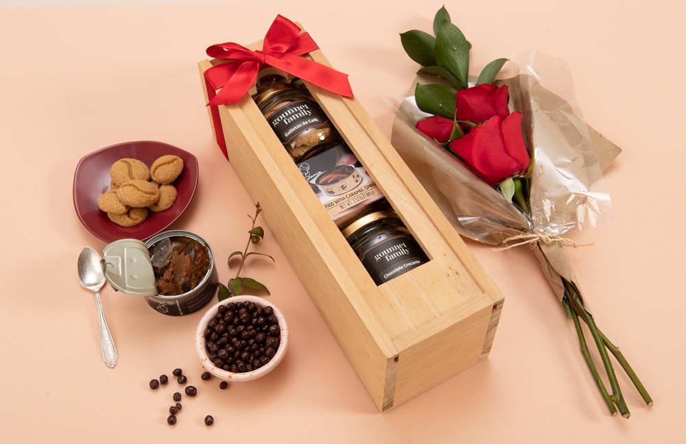 Hermosa caja de madera que contiene botella de Baileys (700 ml) acompañada de pistachos (50g aprox), torta negra artesanal (100g), chocolate crocante (30g aprox) y 2 mini velas con fragancias cítricas aromatizantes.