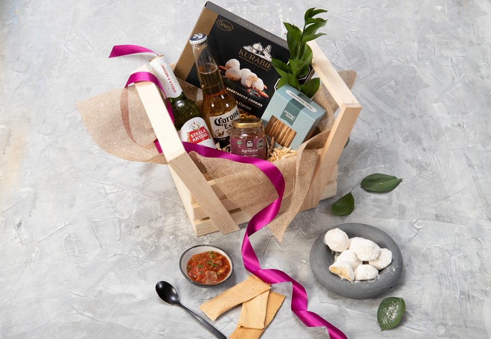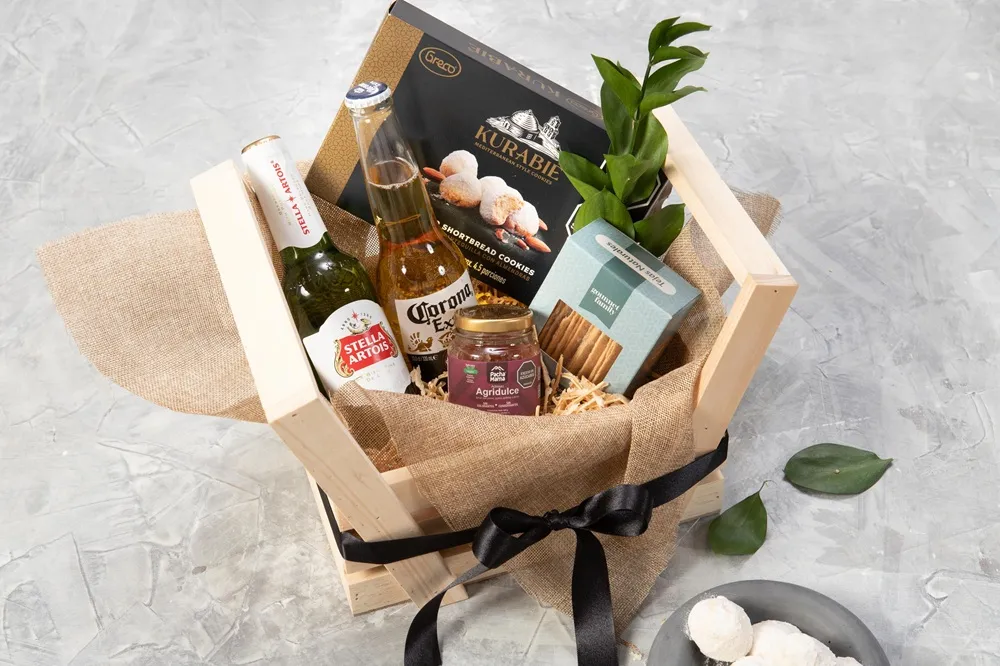 Canasta de madera con cerveza Stella, cerveza Corona, galletas para untar (90g aprox), dip agridulce (130 ml) y galletas de mantequilla polvorosas