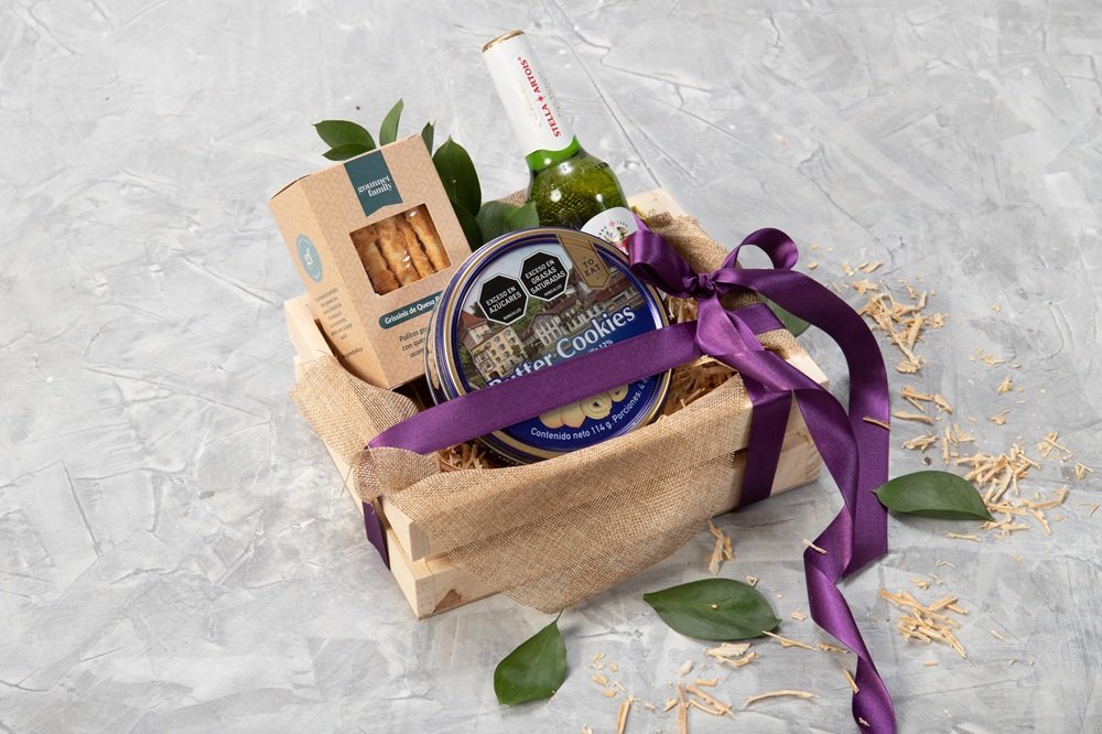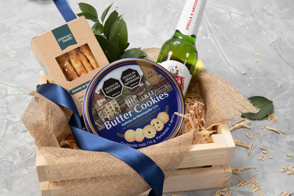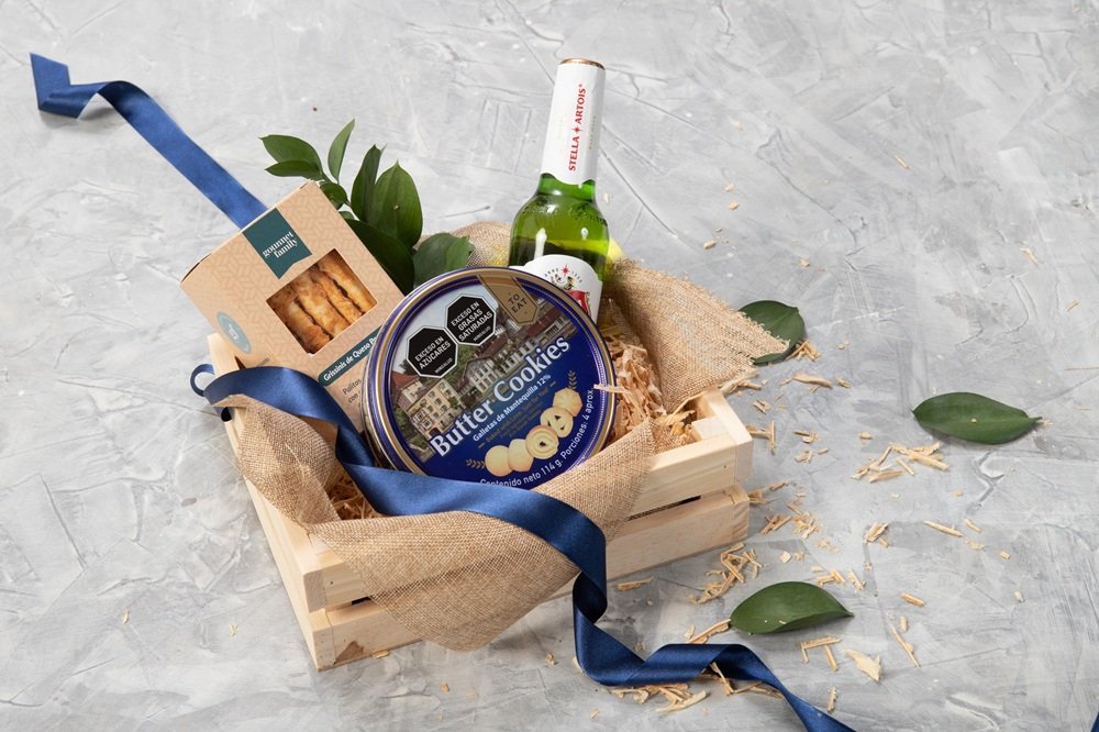 Canasta de madera con cerveza Stella, cerveza Corona, galletas para untar (90g aprox), dip agridulce (130 ml) y galletas de mantequilla polvorosas