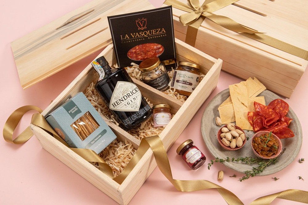 Caja de madera de pino que contiene media botella de ginebra Hendricks (375 ml) acompañada de agua tónica Mil 976, 4 botánicos artesanales (frutos rojos, frutos cítricos, frutos amarillos y jengibre rojo), pistachos con sal (50g aprox), torta de naranja con amapola (100g) y jigger.