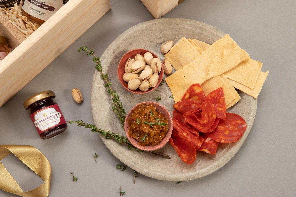 Media botella de ginebra Hendricks acompañada de carnes maduradas (30g), tejas naturales (galletas gourmet 90g aprox), 2 confituras de vino (c/u de 30 ml), pistachos con sal (40g aprox) y dip a base de orellanas (130 ml)
