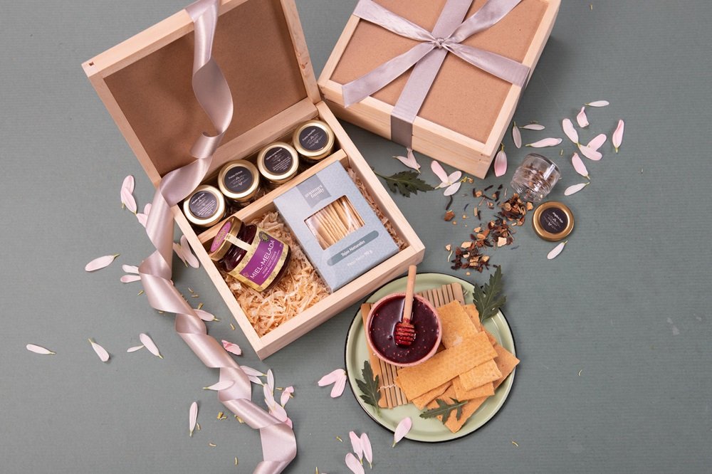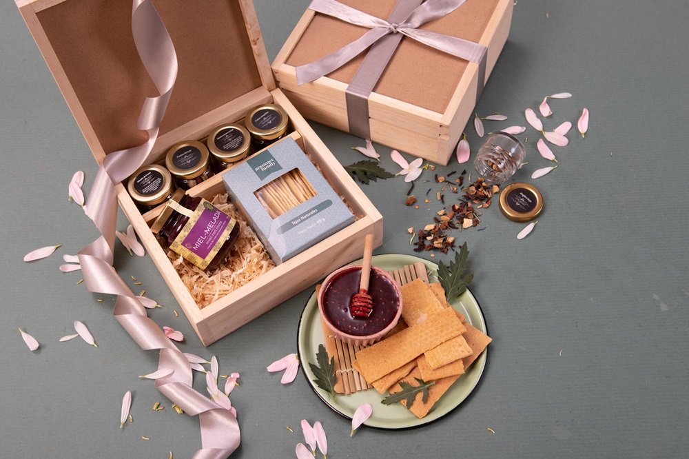 4 diferentes infusiones naturales (frutos amarillos, frutos rojos, frutos cítricos y canela-naranja), tejas naturales (90g aprox) y miel melada (130 ml).
