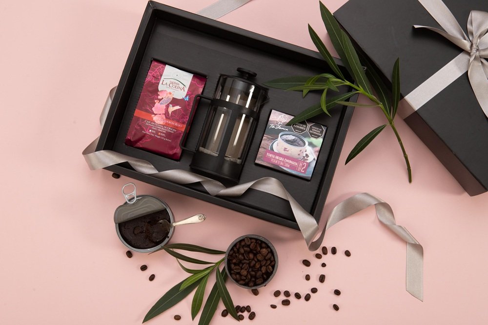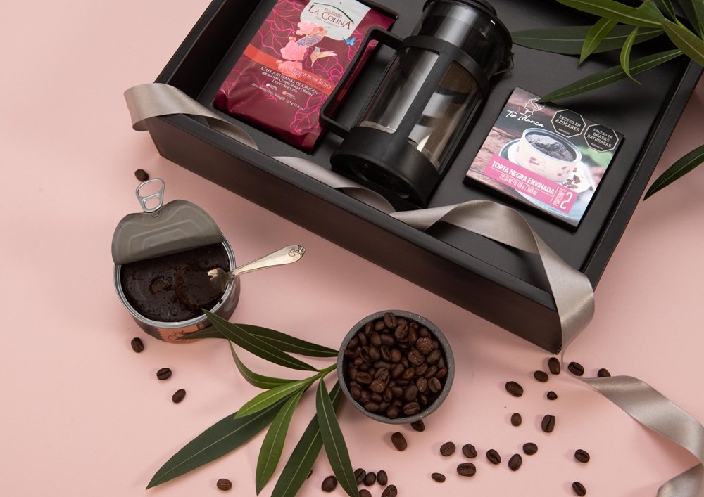 Café 100% colombiano (125g, acompañado de miel artesanal (130ml), torta de amaretto (150g), tejas naturales (90g), almendras (40g aprox), chocolate crocante (40g aprox) y pistachos con sal (40g aprox).