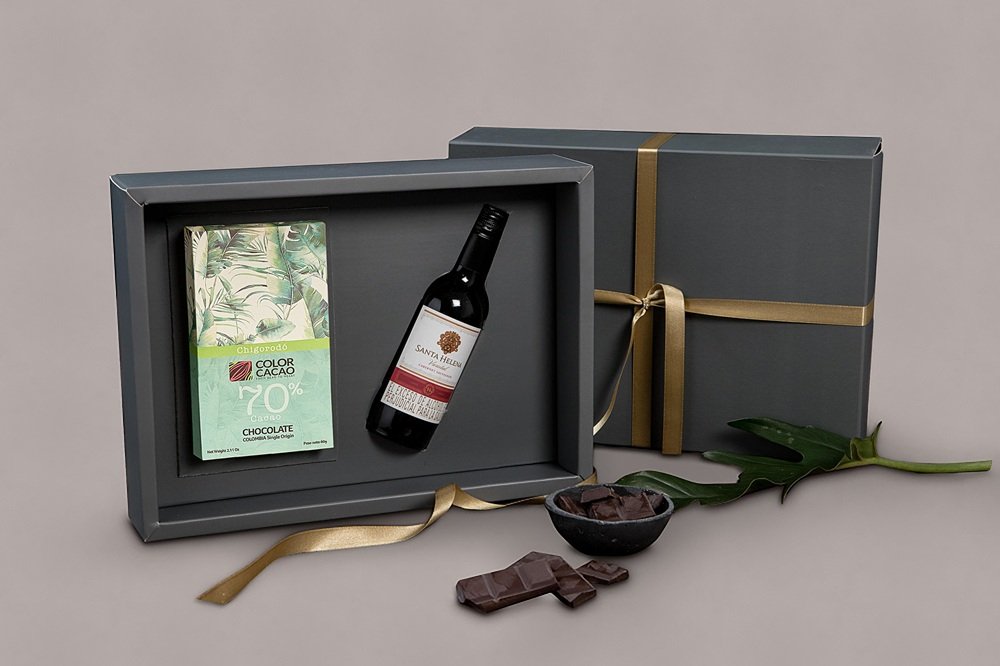Botella de vino (750 ml) acompañada de mix de chocolates artesanales de diferentes regiones de Colombia y copa de vino